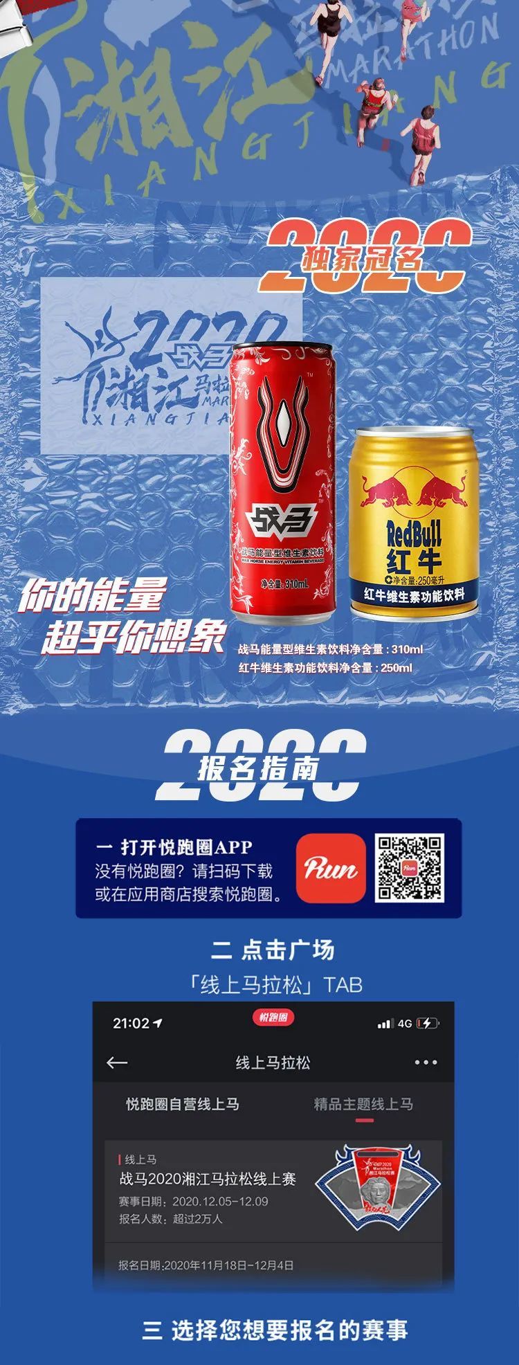 ? 报名途径:选手们需登录线上跑官方指定跑步类APP—“悦跑圈”-点击「广场」-「线上马拉松」入口,选择战马2020湘江马拉松线上赛